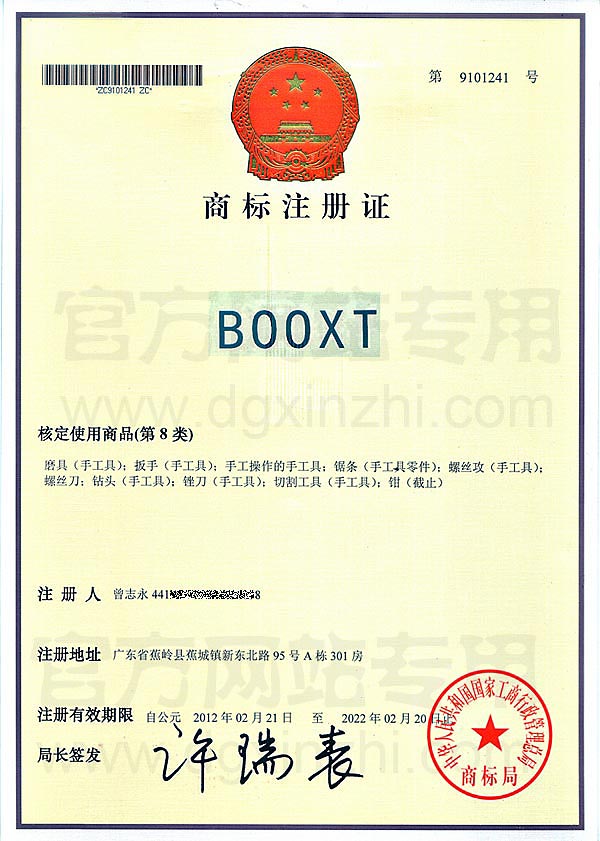 • BOOXT第8類商標(biāo)注冊(cè)證
